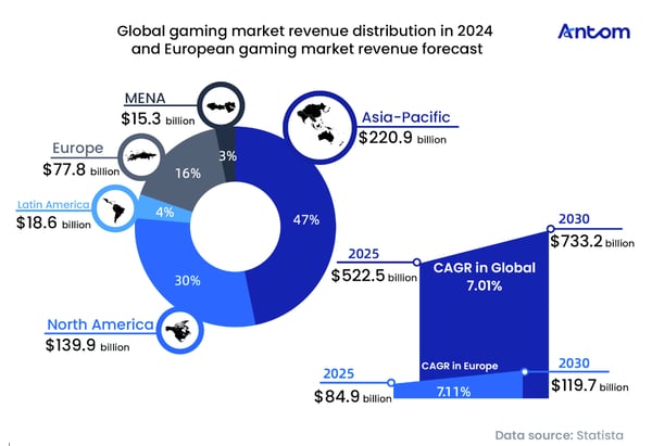 In the global gaming landscape, Europe plays a pivotal role. In 2024, the region generated $77.8 billion in gaming revenue, representing around 16% of the global total and ranking third worldwide after Asia-Pacific ($220.9 billion) and North America ($139.9 billion). This position is underpinned by its vast player base and mature industrial ecosystem: Europe is home to hundreds of millions of gamers, over 5,900 development studios and more than 90,000 industry professionals, all of which provide a solid foundation for sustained innovation and growth.