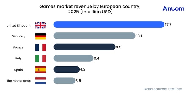 A closer look at Europe’s market structure reveals a strong concentration within a handful of core countries. According to Statista, the United Kingdom is expected to lead in 2025 with a market value of $17.7 billion, followed by Germany and France. Together, these three markets account for nearly half of Europe’s total gaming revenue, forming the continent’s primary growth engine. Notably, although Germany surpasses the UK in terms of player numbers, the UK continues to generate higher revenue, reflecting UK players’ stronger average spending power and higher willingness to pay. Beyond the top three, markets such as Italy, Spain and the Netherlands also play important roles within Europe’s gaming ecosystem, collectively supporting the industry’s ongoing growth.