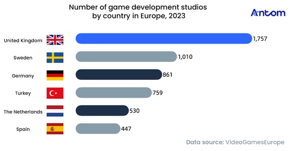 Europe’s gaming landscape is defined not only by the scale of its player base but also by the strength of its content creation capacity. The region has built a diverse and dynamic creative ecosystem, reflected in its extensive base of game studios. According to 2023 data, the UK leads by a wide margin with 1,757 studios – this strong content production capacity continues to bolster its position as Europe’s largest gaming market.