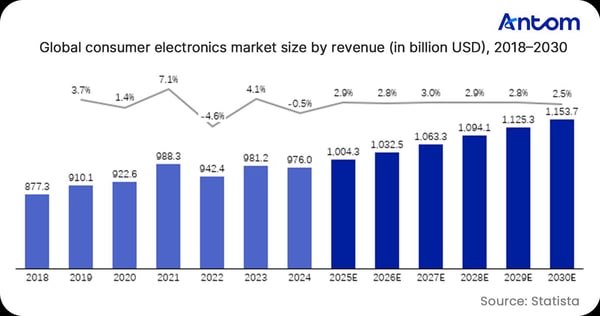 The global 3C market reached $976 billion in 2024 and is expected to surpass one trillion dollars in 2025, entering a period of steady, moderate growth. Consumers’ willingness to spend on electronics continues to rise, with communication devices remaining the largest category, while emerging segments such as gaming hardware and drones show strong upward momentum.