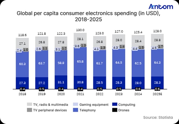In recent years, per-capita spending on consumer electronics has risen steadily, increasing from around $123 in 2022 to an estimated $128 in 2025. This upward trend reflects not only the market’s overall recovery but also growing consumer willingness to invest in higher-value electronic products. Communication devices continue to dominate spending, with their share remaining relatively stable. Meanwhile, categories such as gaming equipment and drones are gaining traction, underscoring consumers’ sustained appetite for high-value, entertainment-oriented and personalised technology products.