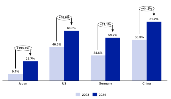 Comparison of personal generative AI usage rate in Japan vs. China, US, Germany, 2023-2024
