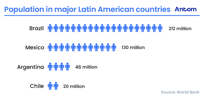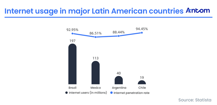 Among major economies, Brazil leads the region with a population of 212 million. Combined with Mexico, Argentina, and Chile, these four countries represent 408 million people — roughly 60% of the regional total — and form the core target markets for cross-border merchants. Brazil is also the largest digital economy, ranking first in both internet users and e-commerce sales.