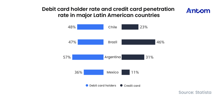 Financial inclusion varies across markets. Brazil is the most mature, where debit card ownership (47%) is on par with credit card penetration rate (46%), supported by the rapid rise of instant payment systems such as Pix. Brazil also leads the region in credit card usage. Mexico, however, has comparatively lower penetration of financial services with large disparities between urban and rural populations. Strict credit approval requirements have also further limited credit card issuance.