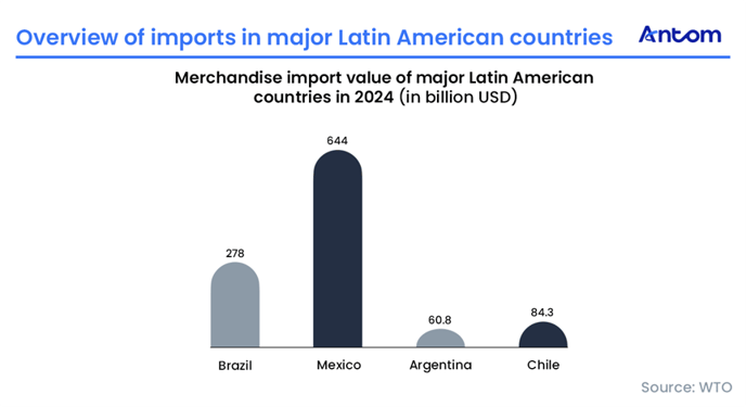 In goods imports, Mexico leads Latin America, reaching $644 billion in 2024, driven by proximity to the United States and trade agreements such as NAFTA. Mexico imports large volumes of mechanical and electrical products and automotive parts, while categories such as textiles, furniture, toys, and sporting goods have also gained a strong market penetration.