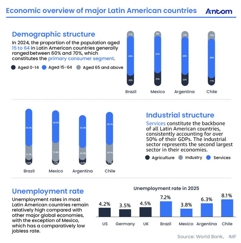 The working-age population (15–64) drives regional consumption. In Brazil, Mexico, Argentina and Chile, this group accounts for 60% to 70% of the total population, reflecting a youthful demographic structure. The service sector consistently accounts for over 50% of GDP, forming the backbone of these economies. Labour market conditions vary: Mexico’s unemployment rate in 2025 remains relatively low, while other markets face higher levels compared with major global economies.