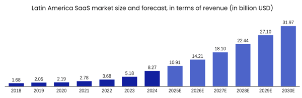 In recent years, Latin America’s SaaS industry has moved firmly into the global spotlight. According to Statista, the region’s SaaS market was valued at approximately $8.3 billion in 2024 and is projected to reach $31.9 billion by 2030, representing a CAGR of 24.88%. This growth rate not only exceeds the global average but also outpaces mature markets such as East Asia and Europe, reflecting the region’s strong momentum in digital transformation.