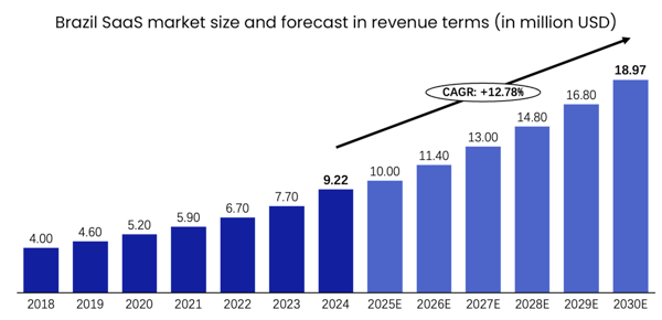 Brazil is not only the largest market within Latin America’s SaaS sector but also the primary driver of overall growth. In 2024, Brazil accounted for about 44.9% of the market, with a market size of approximately $9.22 million, leading the region in number of enterprises, capital investment and cloud infrastructure. More importantly, Brazil’s growth momentum remains strong. By 2030, its market size is expected to reach about $18.97 million, with a CAGR of 12.78% between 2025 and 2030, pointing to a steady growth trajectory and reinforcing its position as the region’s most reliable growth engine.
