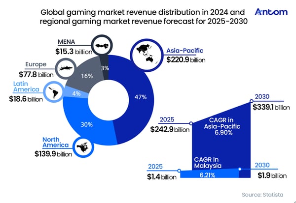 Driven by government ambition, Malaysia is quickly evolving from a traditional consumer market into a strategic gaming hub serving the wider Southeast Asian region. By 2025, Malaysia’s gaming market revenue is projected to reach $1.4 billion, with a compound annual growth rate (CAGR) of 6.21% between 2025 and 2030.