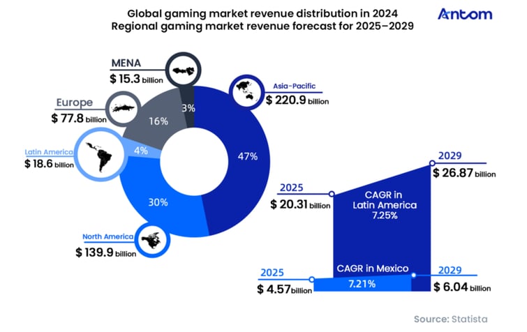 In 2024, Latin America’s gaming market generated USD 18.6 billion in revenue, representing 4% of the global games market value. In recent years, the region has shown strong growth potential, with a projected compound annual growth rate (CAGR) of 7.25%, underscoring its positive momentum and ample room for growth.