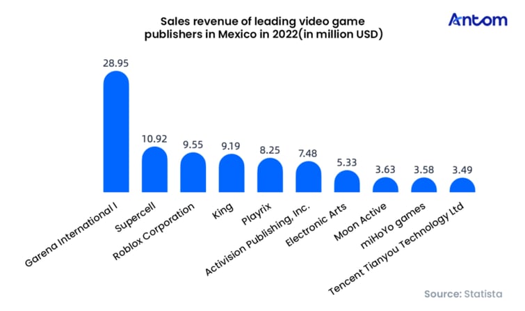 Mexico’s gaming market is dominated by the game’s publisher Garena International I, which posted sales revenue of USD 28.95 million – well ahead of other competitors and underscoring its strong market advantage and leading position. Its flagship title Free Fire remains highly popular among local players and a key driver of revenue growth.
