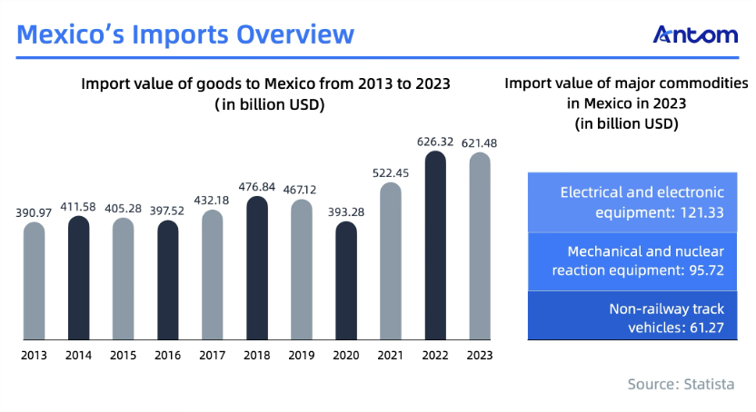 As the world’s 12th largest importer, Mexico saw total goods imports of $621.48 billion in 2023, primarily in electrical and electronic equipment. China ranks as Mexico’s second-largest import source at $114.19 billion, following the United States. Major imports from China include electrical products, auto parts, textiles, furniture, toys, and sporting goods.