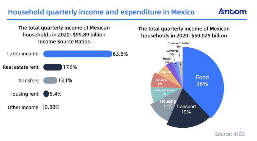 In 2020, Mexico's total quarterly household income reached $99.89 billion, with 63.8% derived from employment income. Transportation and housing dominate expenditures, followed by personal care, education, and cleaning products. Food makes up 38% of household spending, comparable to the Philippines (36%) but much higher than Brazil (20%). This highlights Mexico's rich food culture and focus on quality, reflecting the prevalence of low-income households that prioritise basic needs, resulting in a higher percentage of food expenditure.