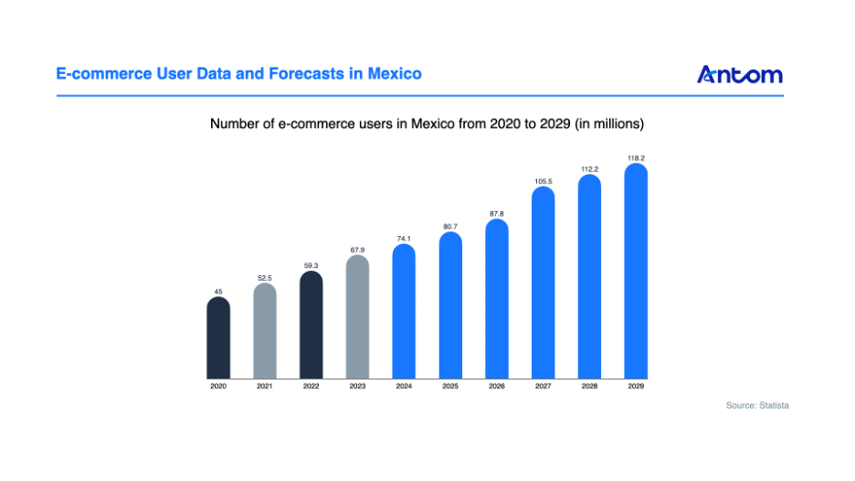 Mexico's GDP hit $1.79 trillion in 2023, keeping its place among major economies with a GDP per capita of $13,790. The e-commerce market has been growing steadily, with users reaching 67.9 million in 2023 and expected to surpass 118 million by 2029. Statista projects a compound annual growth rate (CAGR) for e-commerce of 9.62% from 2025 to 2029, slightly above the Latin American average of 9.43%.
