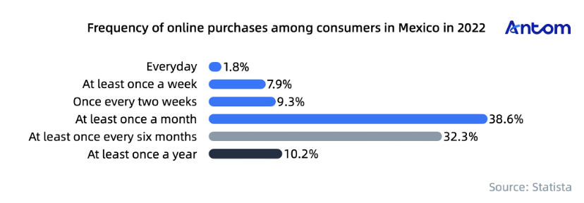 A 2022 survey in Mexico found that 57.5% of consumers shop online at least once per month. While this frequency is lower than that in mature markets such as Brazil and Argentina, it surpasses the online shopping frequency of developing markets such as Peru, Colombia, and Uruguay.