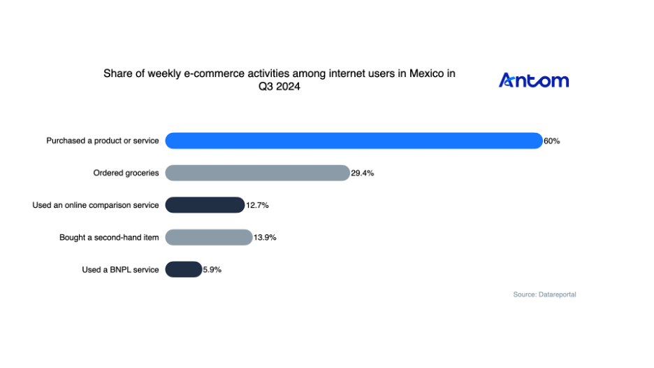 What e-commerce activities do Mexicans engage in? In Q3 2024, respondents indicated that buying products or services was their main activity, accounting for 60%.