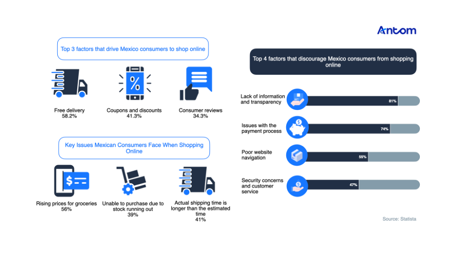 Free shipping, coupons, and reviews drive Mexican online shopping, while price hikes, stock shortages, and slow logistics challenge customers. Additionally, 81% of consumers said that lack of information impedes purchases; 74% point to payment issues as the main reasons for abandoning online shopping.