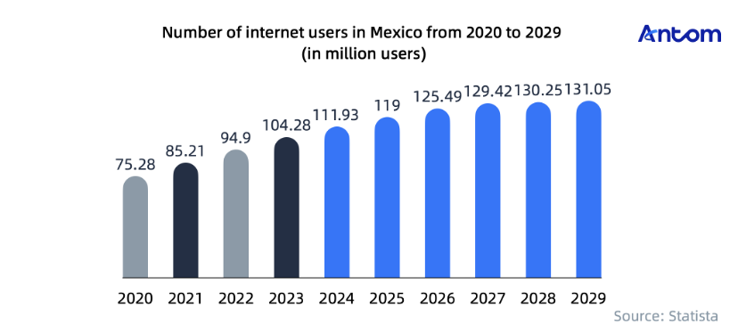 Statista reports Mexico's internet users reached 104 million in 2023, with a penetration rate of 81.2%. Smartphone usage is increasing, with internet penetration projected to hit 98% by 2029.
