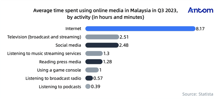 As of the third quarter of 2023, Malaysians spend about eight hours and 17 minutes online daily. Young users aged 16 to 24 spend even more time, mainly watching TV, using social media, and streaming music.