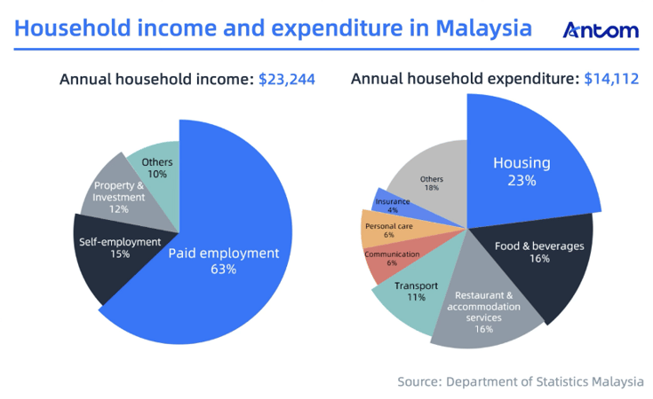 In 2022, Malaysia's average household income was approximately $23,244, mainly from wages and salaries. Consumers spent 22% of their budgets on housing and utilities.