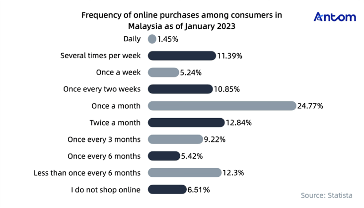 A 2023 survey found that 24.77% shop online monthly, and 11.39% make multiple weekly purchases.