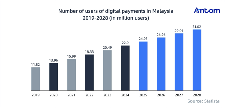 The number of digital payment users in Malaysia has been rising steadily. Statista estimates that from 2024 to 2028, this figure will grow by 35.45%, exceeding 31 million users by 2028, a new record high.