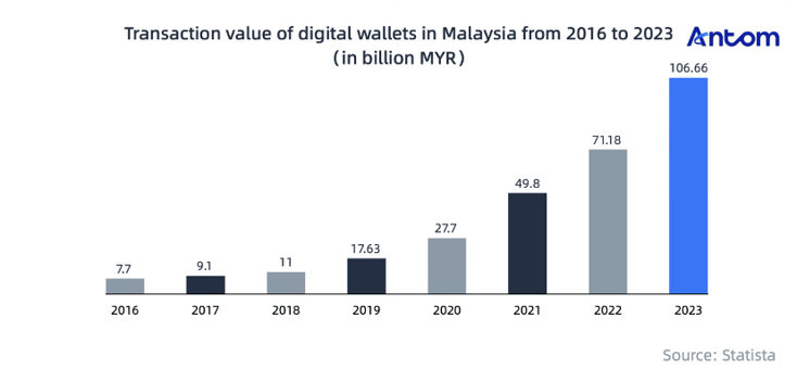 A Statista survey showed that the use of digital wallets rose from 15% in Q1 2019 to 68% in Q1 2022. By 2022, there were 17.8 million digital wallet users in Malaysia, which is 51.5% of the population. In 2023, 50% of consumers used digital wallets weekly, with transaction value reaching MYR 106.7 billion, as shown below: