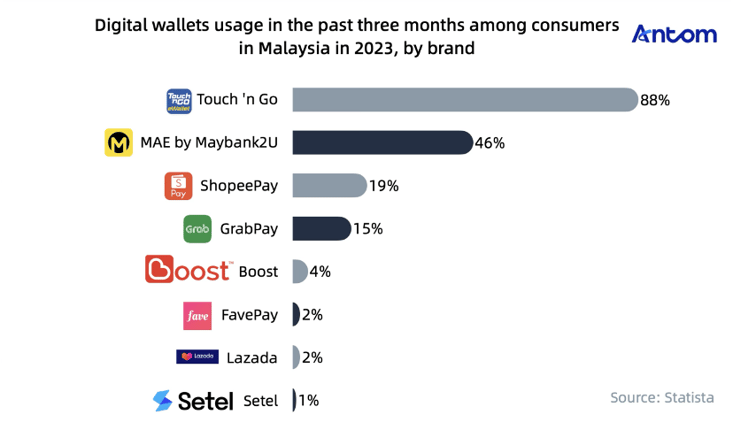 Malaysian consumers have preferences across different digital wallets. A 2023 Statista survey found that 88% of respondents used Touch 'n Go in the past three months, making it the most popular digital wallet. MAE by Maybank2 also enjoyed high usage: