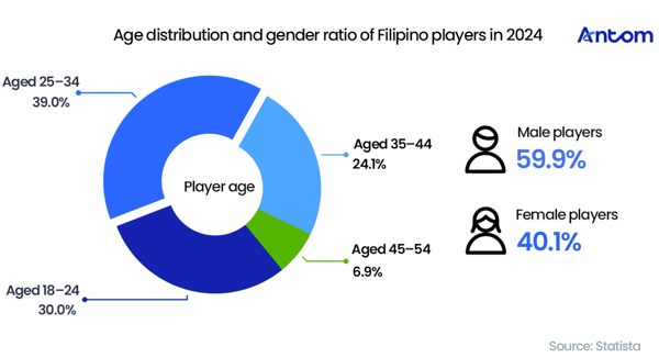 The Philippine gaming market is centred around a young player base, with the largest segment aged 25 to 34, followed by those aged 18 to 24. Collectively, these two groups account for 69% of the market, representing the dominant consumer segment. This “golden age cohort” combines a strong enthusiasm for gaming, high levels of social interaction, and substantial purchasing power.
