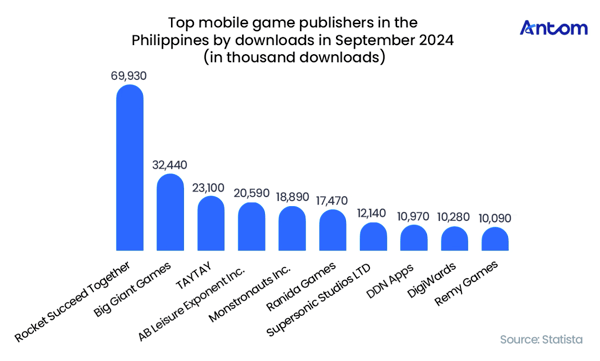 The Philippines has emerged as Southeast Asia’s second largest player pool and a key growth driver in the region. Market revenue is projected to reach $3.52 billion by 2025, with a compound annual growth rate (CAGR) of 6.52% from 2025 to 2030, nearly matching the growth rate of mature markets in Asia-Pacific. In 2024, the player base reached 67.7 million, representing a penetration rate of nearly 60%. A 93% English proficiency rate and robust digital infrastructure are accelerating the adoption of mobile gaming and international content. The market is overwhelmingly mobile-first: download rankings are led by hyper-casual and light casual titles, while top revenue stems from competitive in-app purchases and platform-driven UGC.