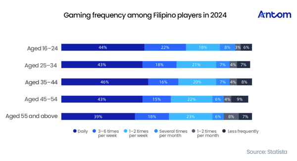 Filipino players exhibit extremely high engagement and gaming frequency. Gaming has become a daily habit rather than an occasional pastime across all age groups, with the “hardcore” middle-aged players even surpassing their younger counterparts. Across all age brackets, the proportion of daily gamers approaches or exceeds 40%, while frequent players (gaming at least 3 times per week) consistently make up more than 60% of the population. This pronounced user engagement indicates that operational strategies designed to boost daily active users—such as daily quests and sign-in rewards—are likely to be highly effective in the Philippine market. Additionally, such engagement creates significant opportunities for advertising-based monetisation models (IAA) and in-app purchase (IAP) designs that encourage frequent, low-value transactions. Furthermore, this data challenges the traditional stereotype that “gaming is exclusively for the young”, with the 35–44 age group recording the highest daily gaming rate at 46%, surpassing even the 16–24 age group.