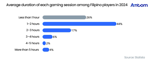 A single gaming session of 1–2 hours is the dominant pattern among Filipino players, accounting for 44% and forming the core of the market. This “golden window” perfectly aligns with the core experience of popular game genres, such as a full MOBA match or a dungeon run. Meanwhile, the market shows clear polarisation. Around 26% of players fall into the “fragmented-time” category, preferring sessions shorter than 1 hour, prompting the need for thoughtful design of hyper-casual games or streamlined features in hardcore games. Nearly 30% are “hardcore” players who require over 2 hours of deep content to meet their demand for immersion.