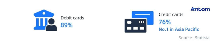 Japan's penetration rate of debit cards is 89%, and that of credit cards is 76% – the latter being the highest in the Asia Pacific region.