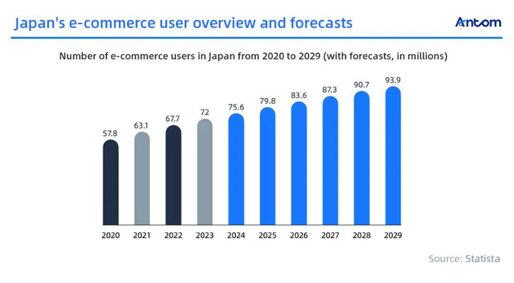The country’s e-commerce market has shown consistent growth in recent years. In 2023, the number of Japanese e-commerce users exceeded 72 million — a figure that’s expected to hit 93.9 million by 2029. A Statista forecast expects Japan’s e-commerce market to grow at a compound annual growth rate (CAGR) of 9.23% from 2024 to 2029.