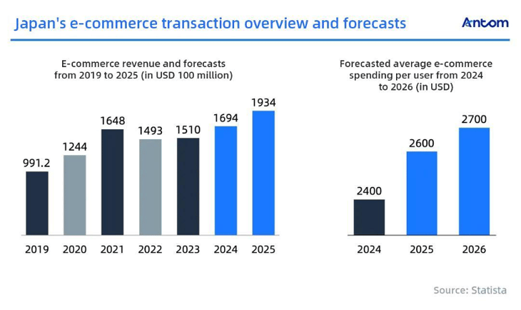 In 2023, Japan’s e-commerce market brought in $151 billion, and it's on track to grow to $193.4 billion by 2025. By the same year, average spending per user is forecasted to hit $2,600.