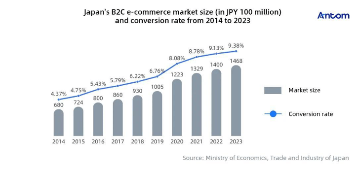 According to statistics from Japan's Ministry of Economics, Trade and Industry, the country’s B2C e-commerce market size and e-commercialisation rate have been consistently growing over the past ten years. However, Japan's e-commercialisation rate stood at only 9.38% in 2023, significantly lower than China's 31% in 2022. This gap highlights the untapped potential of Japan's e-commerce market.