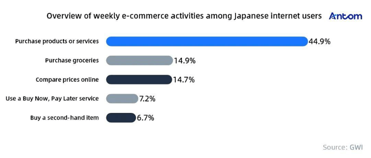 The most popular e-commerce purchases in Japan include clothing and accessories, daily essentials, and books and magazines.