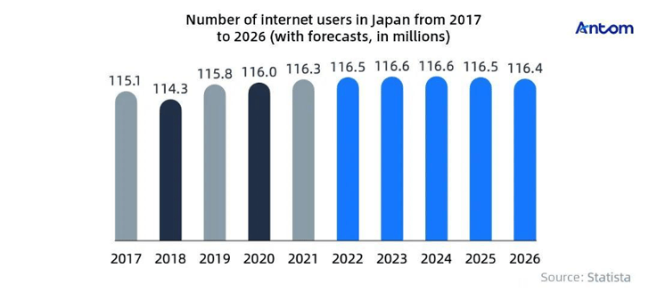 According to DataReportal, the number of internet users in Japan reached 104 million at the beginning of 2024, with a penetration rate of 84.9%. Statista forecasts that this figure will remain steady in the coming years.