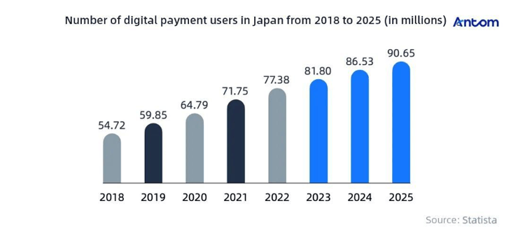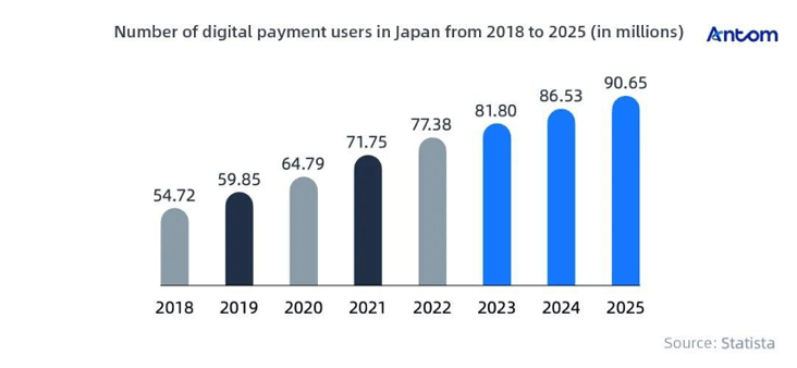 Statista's data shows a dramatic increase in the number of active digital wallet users in Japan, rising from 3.55 million in 2018 to 75.57 million in 2023. This surge indicates that digital wallets are widely accepted by Japanese consumers and hold significant growth potential.