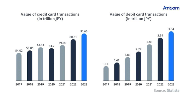 The transaction value of credit cards in Japan exceeded JPY 91.65 trillion (approx. $652.26 billion) in 2023, while debit card transactions reached JPY 3.84 trillion (approx. $27.33 billion). In 2023, the transaction volume of debit cards in Japan grew by 17.4% year-on-year.