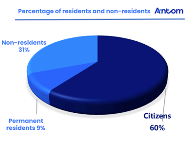 In terms of population structure, as of 2024, Singapore’s total population (including residents and non-residents) stood at approximately 6.037 million, with a resident-to-non-resident ratio of roughly 2:1 (residents include citizens and permanent residents). Population growth has slowed, and the median resident age has reached 42.8 years, reflecting continued ageing of the population. The proportion of residents aged 65 and above (18%) continues to climb. To address these demographic shifts, the Singapore government is actively promoting foreign talent recruitment and enhancing local labour force participation, with permanent residents and non-residents now accounting for approximately 40% of the population.
