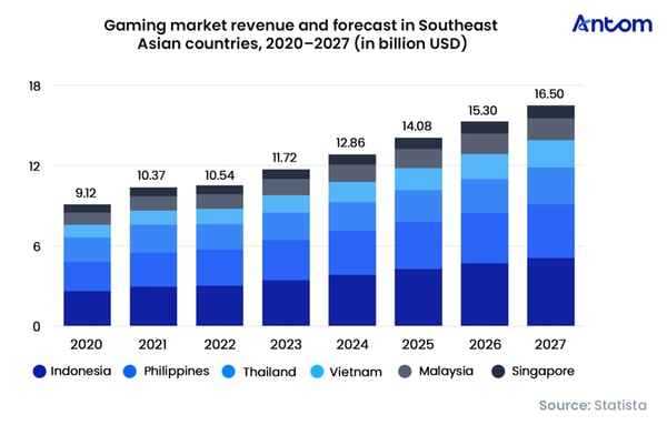 Southeast Asia’s top six gaming markets – Indonesia, the Philippines, Thailand, Vietnam, Malaysia and Singapore – are on a trajectory of rapid growth, demonstrating remarkable resilience and immense potential. After a brief slowdown in 2022, these markets regained strong momentum in 2023 and are expected to continue expanding steadily. By 2024, total gaming revenue across the six Southeast Asian markets had risen to nearly $12.86 billion.