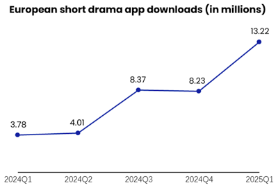 Compared to other markets that have experienced explosive growth, Europe’s short drama sector is characterised by steady, albeit delayed, user adoption and gradual platform penetration. According to Diandian Data, short drama downloads in Europe rose from 3.78 million in Q1 2024 to 13.22 million in Q1 2025, showing a stepwise upward trend that reflects phased breakthroughs in user education, content production, and marketing strategies.