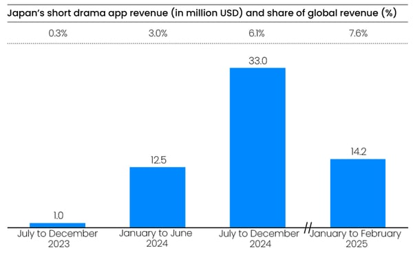 Data from short drama applications indicate that Japan’s short drama market has experienced rapid growth since the second half of 2023. In 2024, app revenues exceeded $45 million, more than 20 times the 2023 figure. In January–February 2025, revenues reached $14 million.