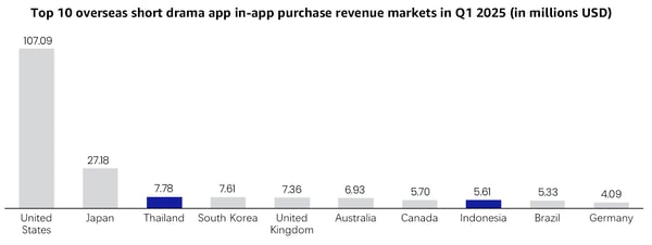 Top 10 overseas short drama app in-app purchase revenue markets, Q1 2025