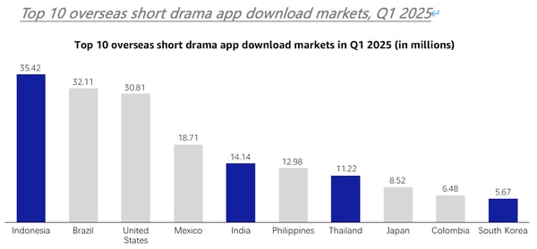 Globally, Southeast Asia has emerged as the largest regional market in terms of short drama app downloads. In 2024, Indonesia ranked No. 2 worldwide with more than 50 million downloads, second only to the US The Philippines, Thailand, and Malaysia also entered the global top 10. By Q1 2025, Indonesia climbed to No. 1 globally with 35.42 million downloads, accounting for nearly 13% of the global market. The Philippines and Thailand ranked sixth and seventh, with 12.98 million and 11.22 million downloads, respectively.