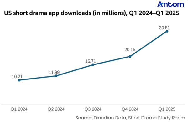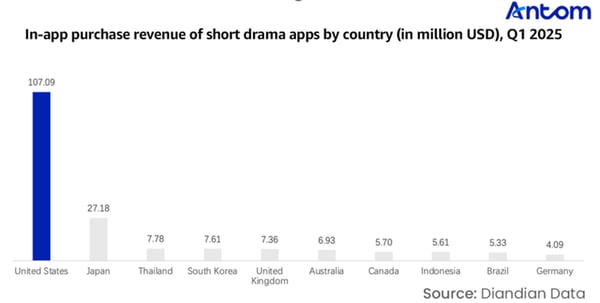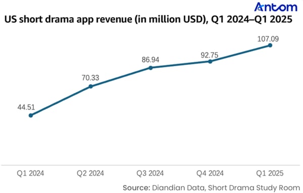 Beyond strong download performance, short drama apps in the US have also seen rapid revenue growth. In 2024, total revenue in the US short drama market reached approximately $295 million, accounting for around 60% of global revenue, securing its position as the world’s largest revenue-generating market. In Q1 2025, US revenue reached $107.1 million, an increase of about 6.65% compared to the 2024 quarterly average, showing continued steady growth momentum.