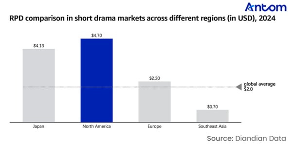 As the world’s largest revenue market for short dramas, the US demonstrates strong market vitality and significant commercial potential. In 2024, in-app purchase revenue from short drama apps in the US reached nearly $300 million, accounting for over 60% of the total global market. The revenue per download (RPD) is as high as $4.7.