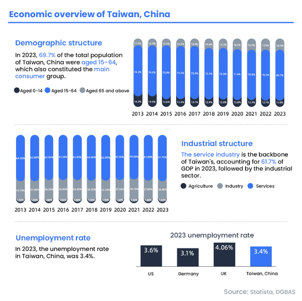 In 2023, nearly 70% of the population fell within the 15–64 age range, forming the core consumer group. Services remain the largest economic contributor at 61.7% of GDP, while industry accounts for nearly 40% and has grown even faster than services over the past decade. Thanks to its crucial role in the global high-tech supply chain, the unemployment rate in 2023 remained low at just 3.4%.