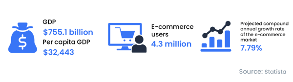 In 2023, GDP reached USD 755.1 billion, with a per capita GDP at US$32,443. The e-commerce sector has grown steadily, with 4.3 million online shoppers recorded in 2023 and projections rising to 6.9 million by 2029. According to Statista, e-commerce revenue is expected to expand at a CAGR of 7.79% from 2024 to 2029.